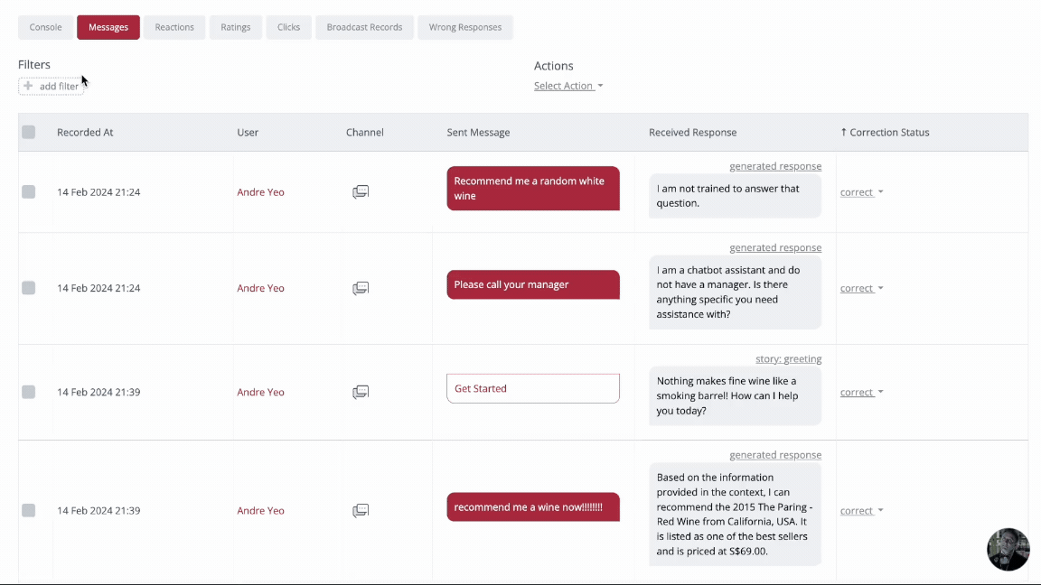 In the messages tab, you can view all conversations in a table format. Every row in the table indicates an interaction, also known as a chat log. This view is useful for