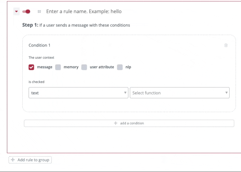 <table><thead><tr><th width="237">Function</th><th>Description</th></tr></thead><tbody><tr><td><strong>has keyword</strong></td><td>This function checks if the message contains a specific keyword or phrase.</td></tr><tr><td><strong>does not have keyword</strong></td><td>This checks if a specific keyword or phrase is not present in the message.</td></tr><tr><td><strong>equals</strong></td><td>This checks if the message exactly matches a specific value or keyword.</td></tr><tr><td><strong>does not equal</strong></td><td>This checks if the message does not match a specific value or keyword.</td></tr><tr><td><strong>matches regex</strong></td><td>This checks if the message matches a regular expression pattern.</td></tr><tr><td><strong>exists</strong></td><td>This checks if a specific property or value exists in the user’s data.</td></tr><tr><td><strong>does not exist</strong></td><td>This checks if a property or value does not exist in the user’s data.</td></tr><tr><td><strong>less than</strong></td><td>This checks if a number is less than another value.</td></tr><tr><td><strong>greater than</strong></td><td>This checks if a number is greater than another value.</td></tr><tr><td><strong>has tags</strong></td><td>This checks if the user's message has tagged entities.</td></tr><tr><td><strong>does not have tags</strong></td><td>This checks if the user's message does not have tagged entities.</td></tr><tr><td><strong>is exactly</strong></td><td>This checks if the message exactly matches a specific keyword, as opposed to containing it.</td></tr><tr><td><strong>is not exactly</strong></td><td>This checks if the user's message does not exactly match a given keyword or phrase.</td></tr><tr><td><strong>has exact tag</strong></td><td>This checks if the user's message "is exactly" a tagged entity.</td></tr><tr><td><strong>does not have exact tag</strong></td><td>This checks if the user's message is not "is exactly" a tagged entity.</td></tr><tr><td><strong>is emoji</strong></td><td>This checks if the user's message is exactly an emoji.</td></tr></tbody></table>