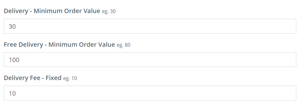 * **Delivery Fee - Fixed** (enter delivery fee for orders below minimum order value threshold).