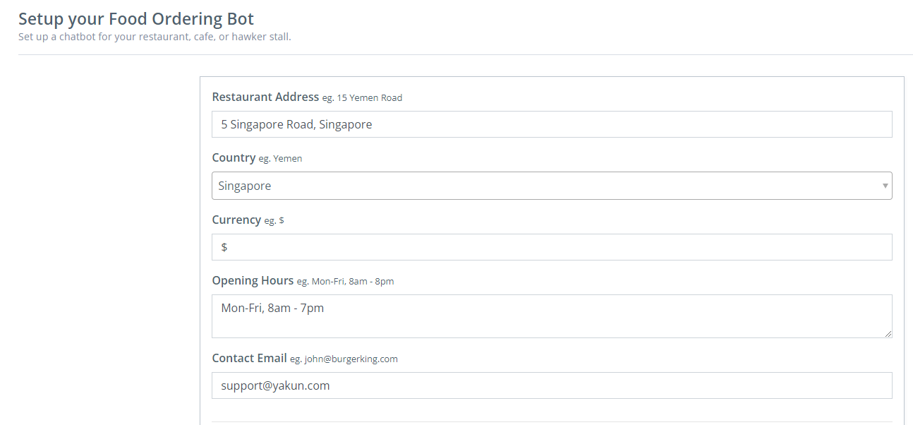 <figure><img src="https://2535542804-files.gitbook.io/~/files/v0/b/gitbook-x-prod.appspot.com/o/spaces%2F-LirAdLo22OkAW9w3tvY%2Fuploads%2FLgl3QgiP8PftESwklp8G%2Fimage.png?alt=media&#x26;token=e5b0b12d-b11c-40f1-9570-2cc8178c75d6" alt=""><figcaption><p>Generating Food Ordering Bot after Entering Specifics</p></figcaption></figure>