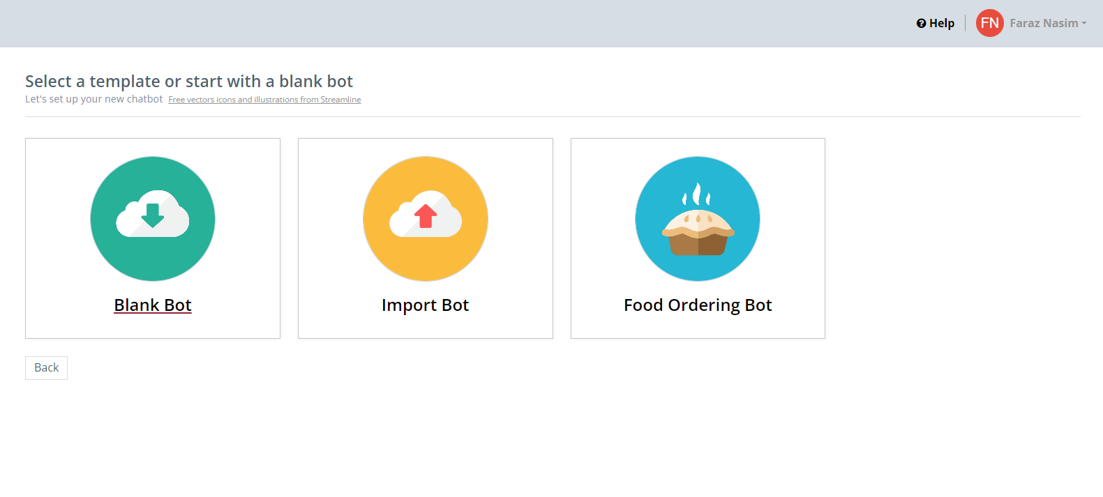 2. Select from **Blank Bot**/**Import Bot**/**Food Ordering Bot\***.