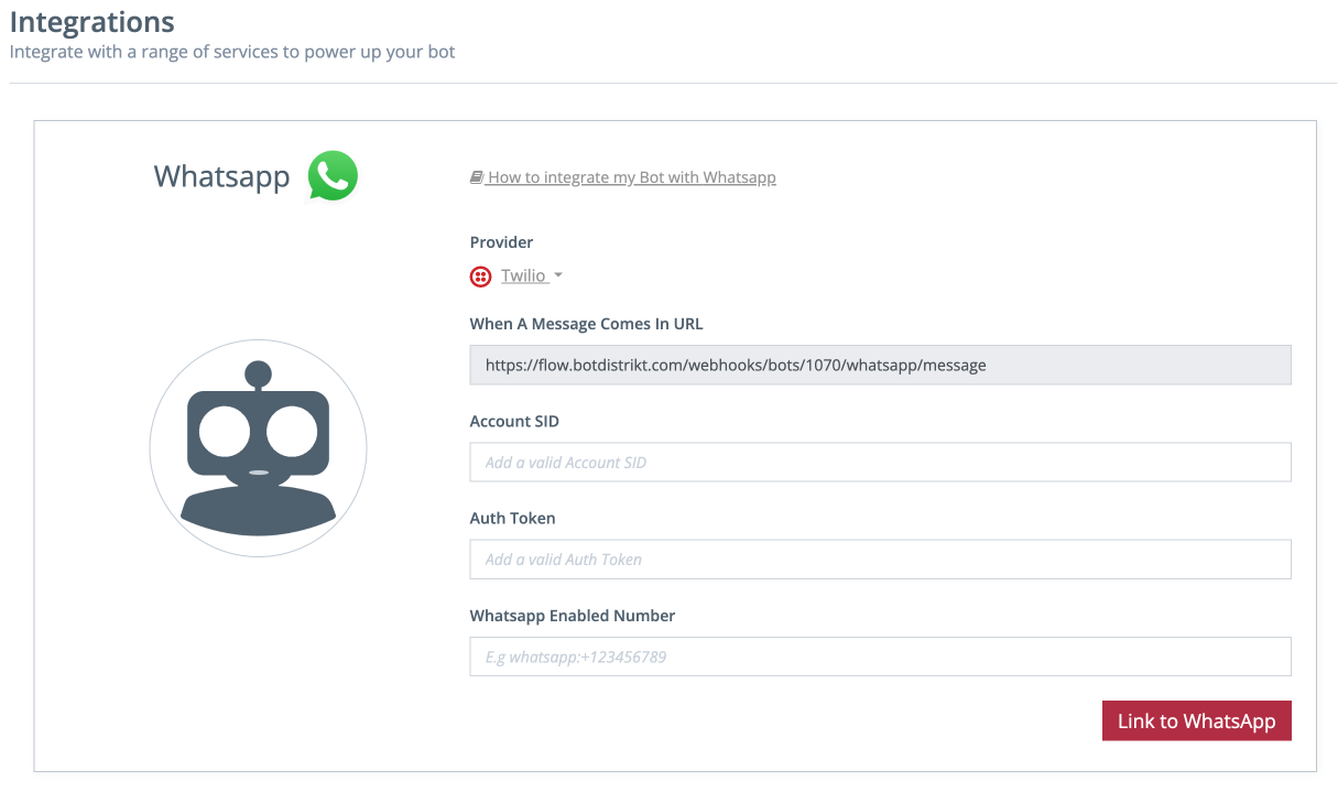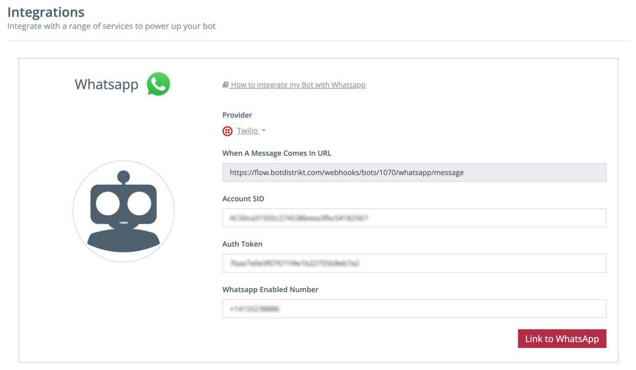 For example, if the number you copy from Twilio is +1 415 523 8886, The number you will need to key into BotDistrikt is whatsapp:+14155238886