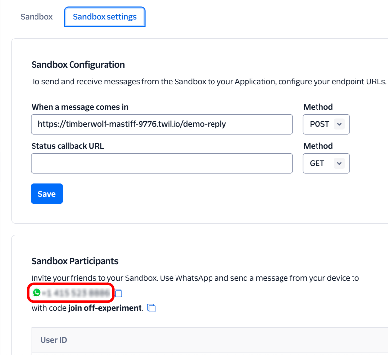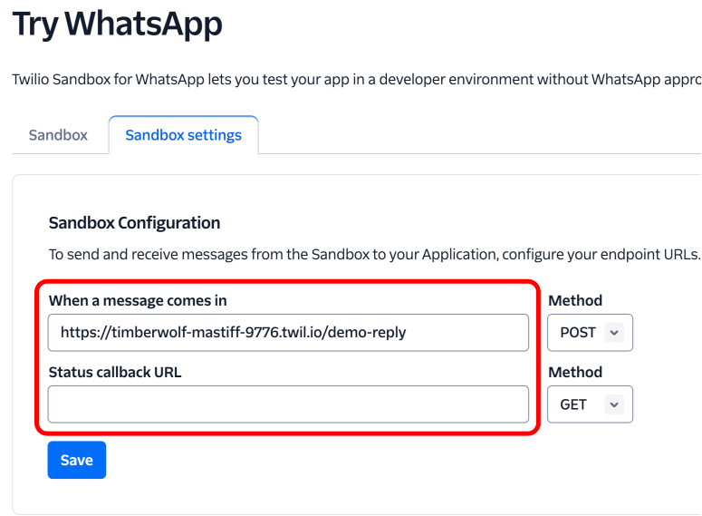 Click Settings > WhatsApp Sandbox Settings and paste the respective endpoint URLs there
