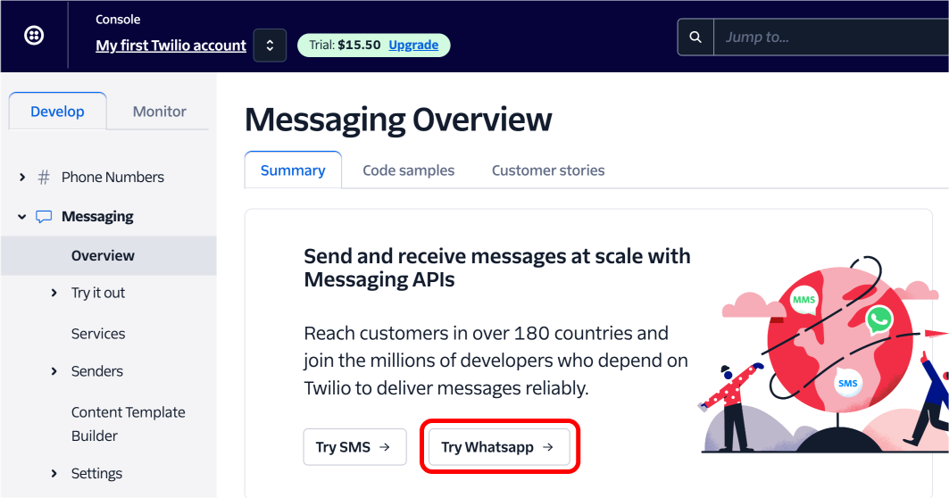 Click on the Messaging tab and click on Overview > Try WhatsApp