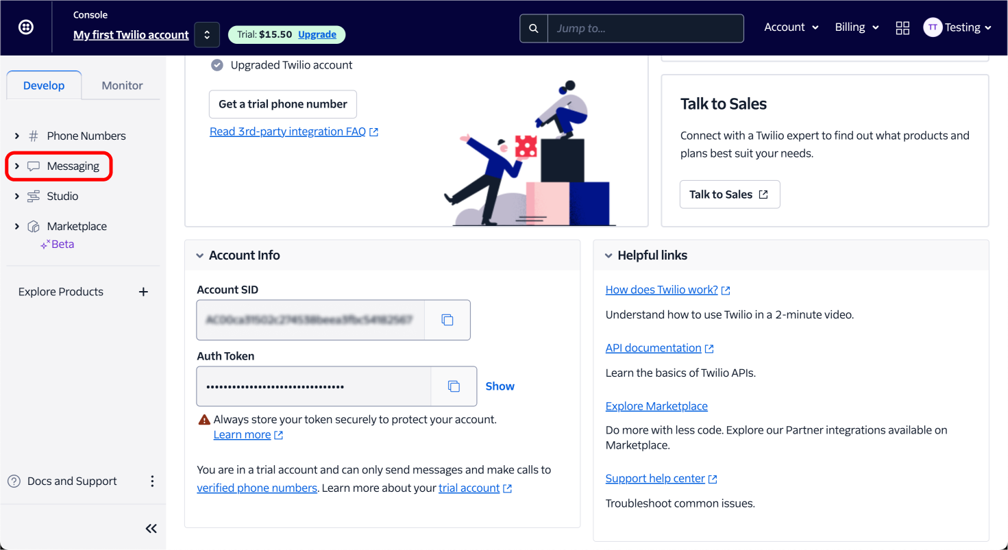 We have our Account SID and Auth Token ready. We need to get the WhatsApp Enabled Number ready now.