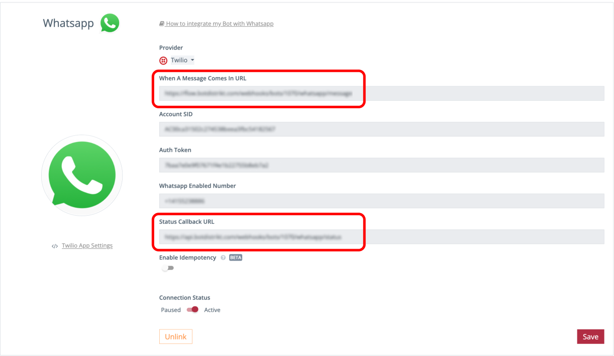When it is linked, take note of the When A Message Comes In and Status Callback endpoint URLs